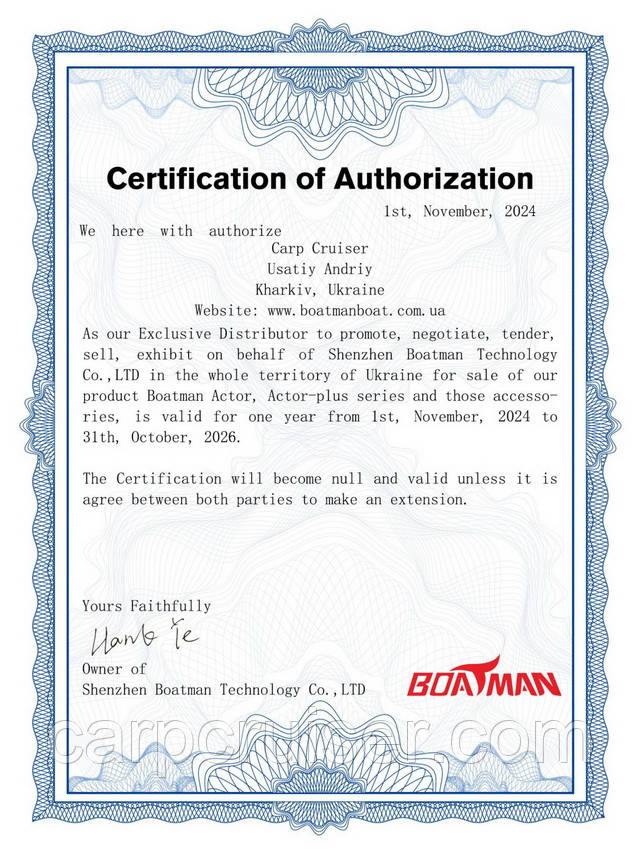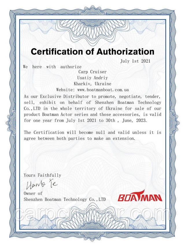 Торгівельна марка Сarp Cruiser® з 2021 року є офіційним дистриб'ютором якіснного виробника коропових корабликів для риболовлі Boatman boat
